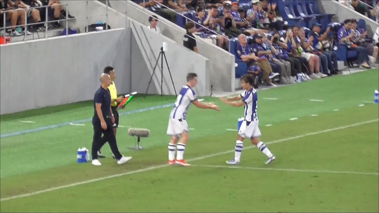 Lorsque Kubo Takefusa se retire sur le banc par des substitutions, il regarde avec de grands applaudissements dans le stade. . V. Falane Nagasaki vs Real Sociedad Peace Stadium Nagasaki Stadium City 20250721