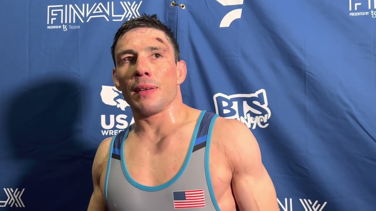 Ildar Hafizov (Army WCAP) après avoir battu Dalton Roberts (Army WCAP) deux matchs contre un dans la série gréco-romaine des 60 kg au Final X 2023 à Newark, NJ