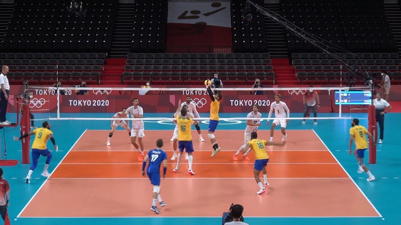 Bruno Rezende setting Team Brazilat Tokyo 2020 Olympic Games. Spikes by Leal, Wallace Souza, Lucarelli, Lucas Saatkamp, Douglas Souza and others…