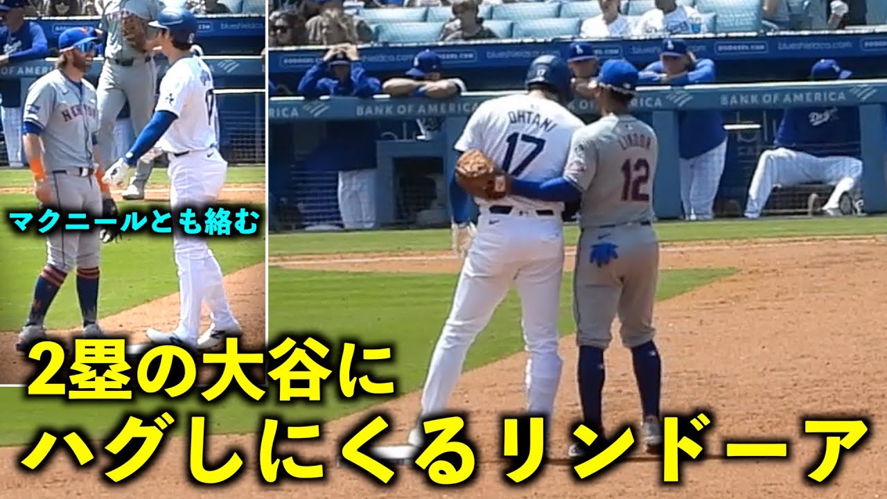 Lindor vient embrasser le joueur de 2e but Shohei Otani qui frappe un coup sûr pour égaliser le match ![Images locales]Dodgers vs Mets, match 2, 21 avril