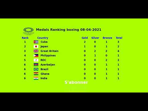 BOXE Jo 2021 Tokyo: Classement des pays par nombre des médailles d’or JO 2021, d’argent et de bronze et selon les poids lourds ou plume ou par kgs.