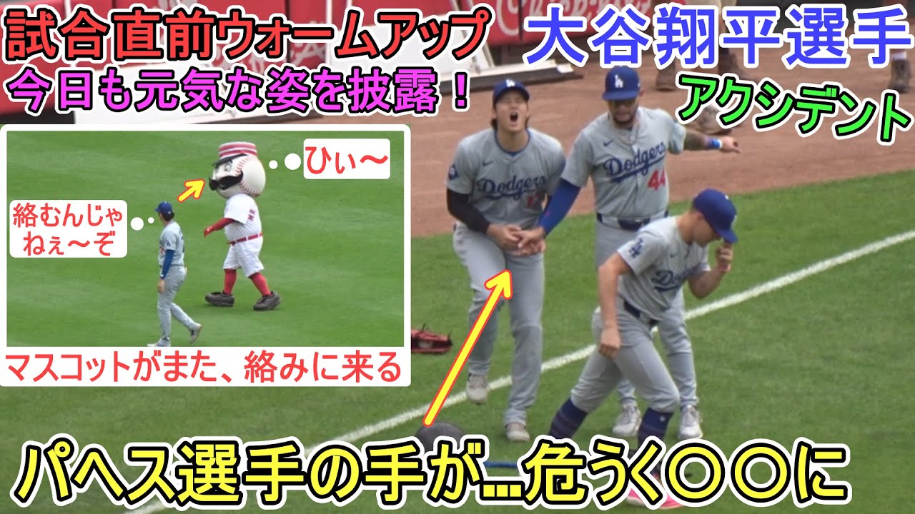 Un accident s’est produit lors de l’échauffement juste avant le match ! La main de Pages touche presque Shohei Otani. Il est sur le point de se retrouver à nouveau mêlé à la mascotte des Reds, mais il dégage une aura qui dit : « Ne vous emmêlez pas avec moi. » contre les Reds de Cincinnati ~ Dernier match de la série ~ Shohei Otani a joué en tant que DH n°2. 26/05/2024 @shinsukehandyman #Shohei Otani #Dodgers #shoheiohtani