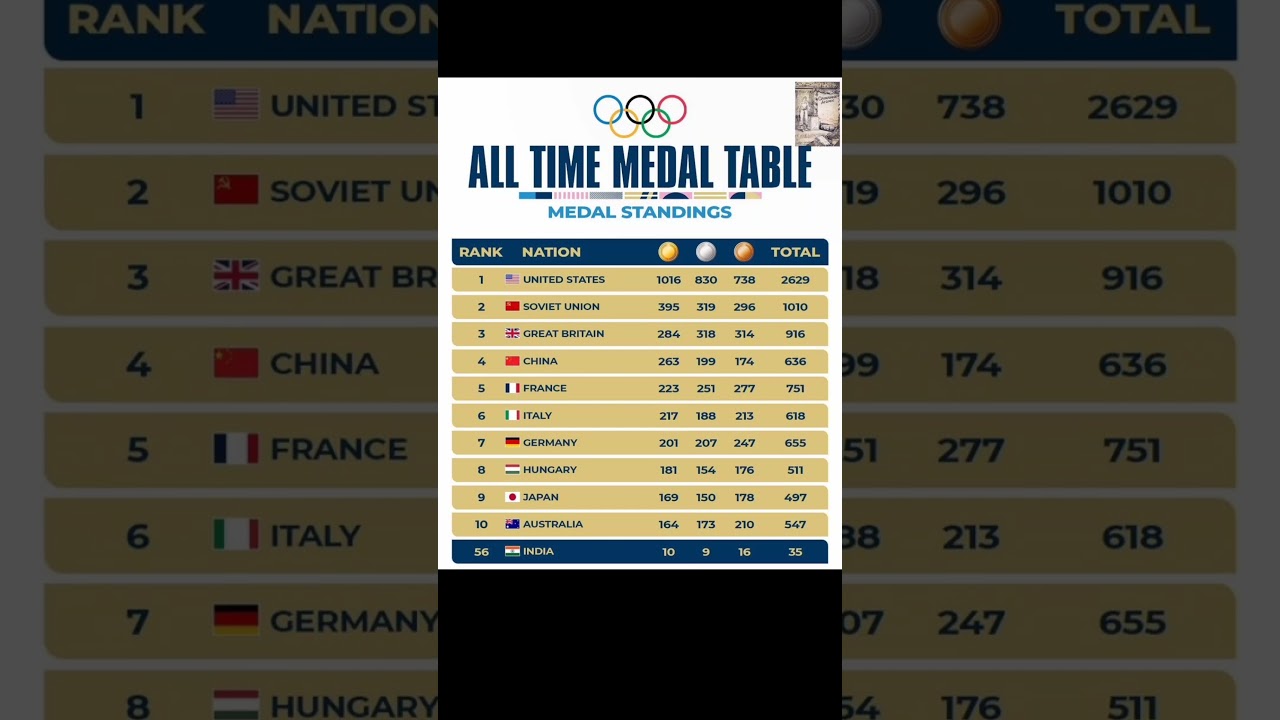 Tableau des médailles de tous les temps#olympics#india#usa#shorts#ytshort#parisolympics2024#tokyo#australia#goldmedal