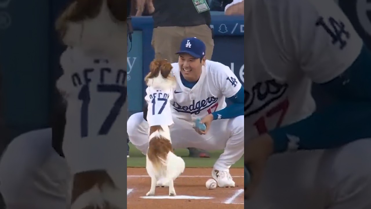 Le chien de Shohei Ohtani, Decoy, lance le premier lancer lors de leur soirée bobblehead. #mlb #shoheiohtani #baseball