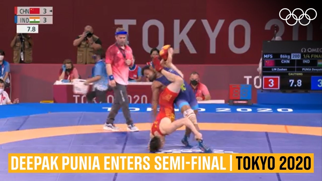 📲 Abonnez-vous à @olympics : http://oly.ch/Subscribe Le lutteur indien Deepak Punia accède à la demi-finale après ses victoires contre le Nigérian Ekerekeme Agiomor (12-1) et le Chinois Lin Zushen (6-3) Les Jeux Olympiques d’été de Tokyo 2020 se déroulent au Japon, du 23 juillet 2021 au 8 août 2021. #Jeux olympiques | #UnisParÉmotion | #Plus FortEnsemble | #Tokyo2020 _____________________________________________________ 🇨🇳 #Beijing2022 replays : https://oly.ch/B22Replays 🇯🇵 #Tokyo2020 replays : https://oly.ch/T20Replays 🗞️ Actualités du monde olympique : https://oly.ch/Actualités