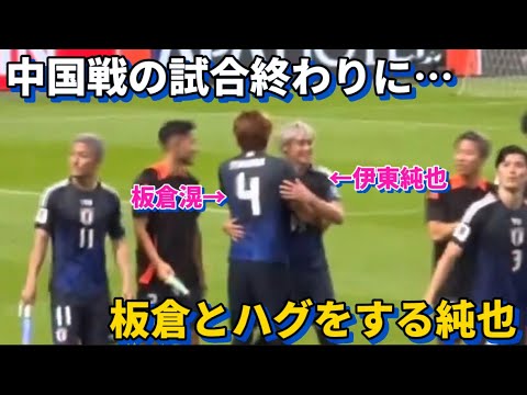 Junya Ito souriant et serrant Akira Itakura dans ses bras lors de la ronde de salutations après le match contre la Chine, c'était tellement mignon ! !