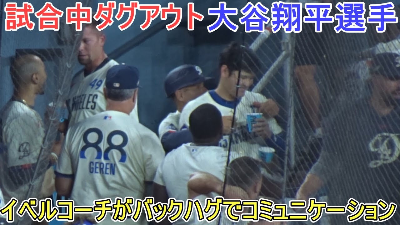 Shohei Otani dans l’abri pendant le match. Communiquez tout en étant pris dans les bras de Coach Ivel. Betts communique avec le lanceur Treinen. contre les Cleveland Guardians ~2ème match de la série~ 9.07.2024 @shinsukehandyman #Shohei Ohtani #Dodgers #shoheiohtani