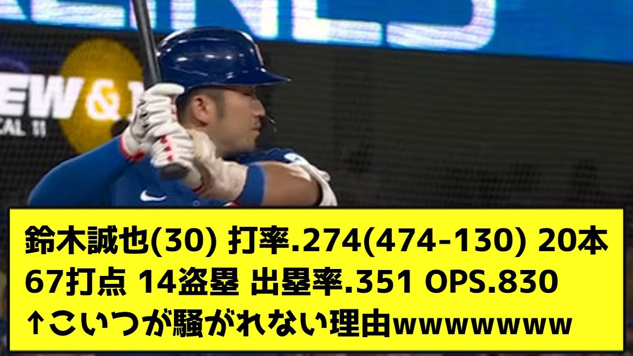 Seiya Suzuki (30) Moyenne au bâton : .274 (474-130) 20 coups sûrs, 67 points produits, 14 buts volés, pourcentage sur la base : .351 OPS.830 ← Raison pour laquelle ce type ne fait pas d’histoires wwwwwww[Réaction de Nan J ]