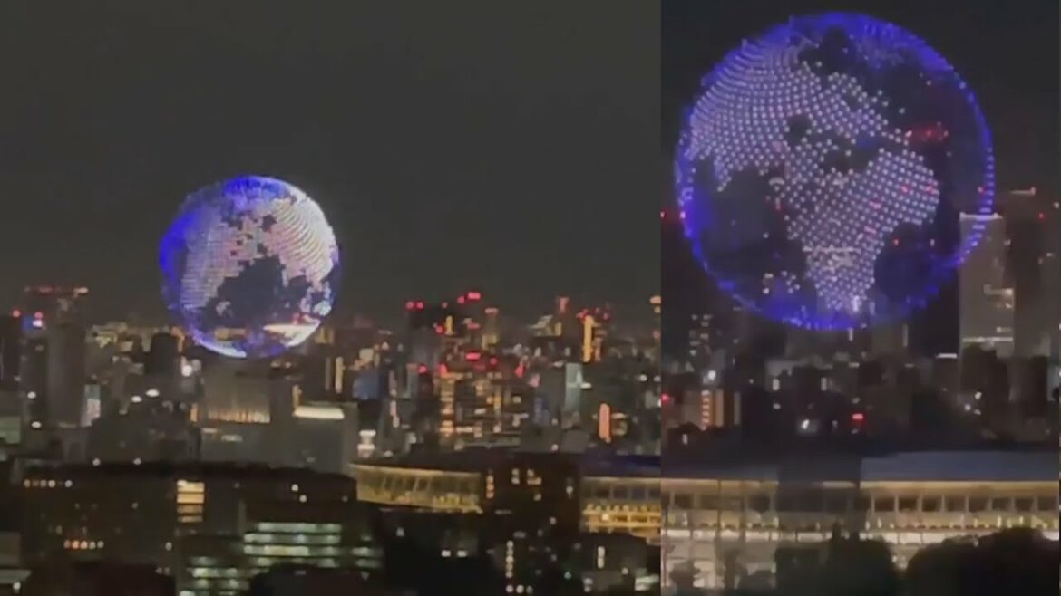 1800 drones above the National Stadium in Tokyo, Japan form a globe at the Tokyo2020 Olympics opening ceremony